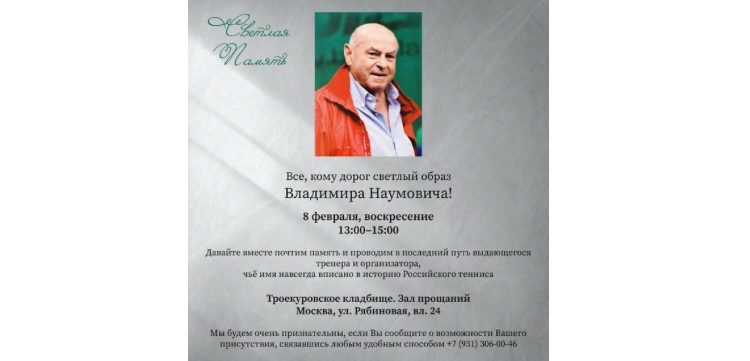 8 февраля состоится прощание с Владимиром Камельзоном — выдающимся тренером и организатором, чьё имя навсегда вписано в историю российского тенниса.